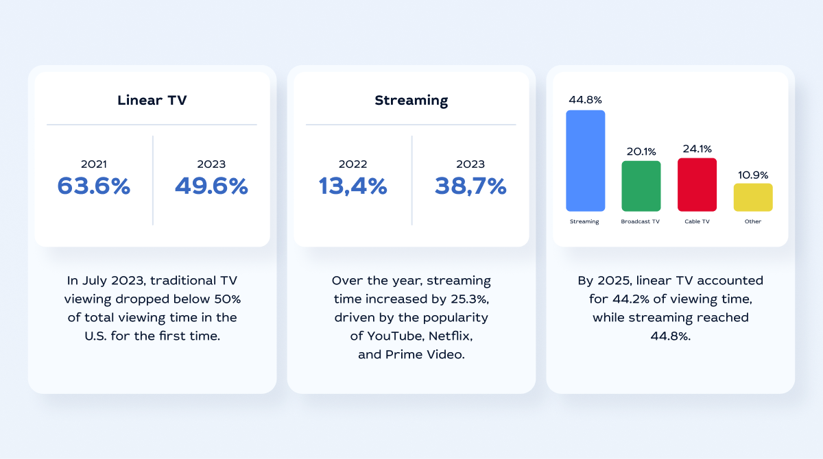 In 2025, streaming surpassed traditional TV for the first time in terms of viewing time share. This is confirmed by Nielsen and Accio data: